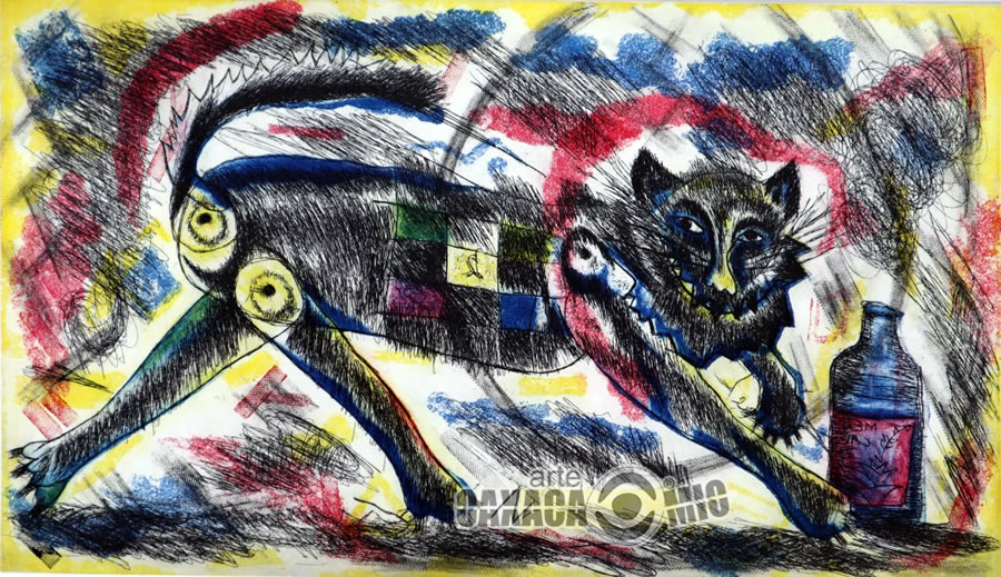 Gato mezcalero, grabado en metal, Medida: imagen 26 x 44.5 cm, papel 37.5 x 56.5 cm, 2020, edi-ción de 40